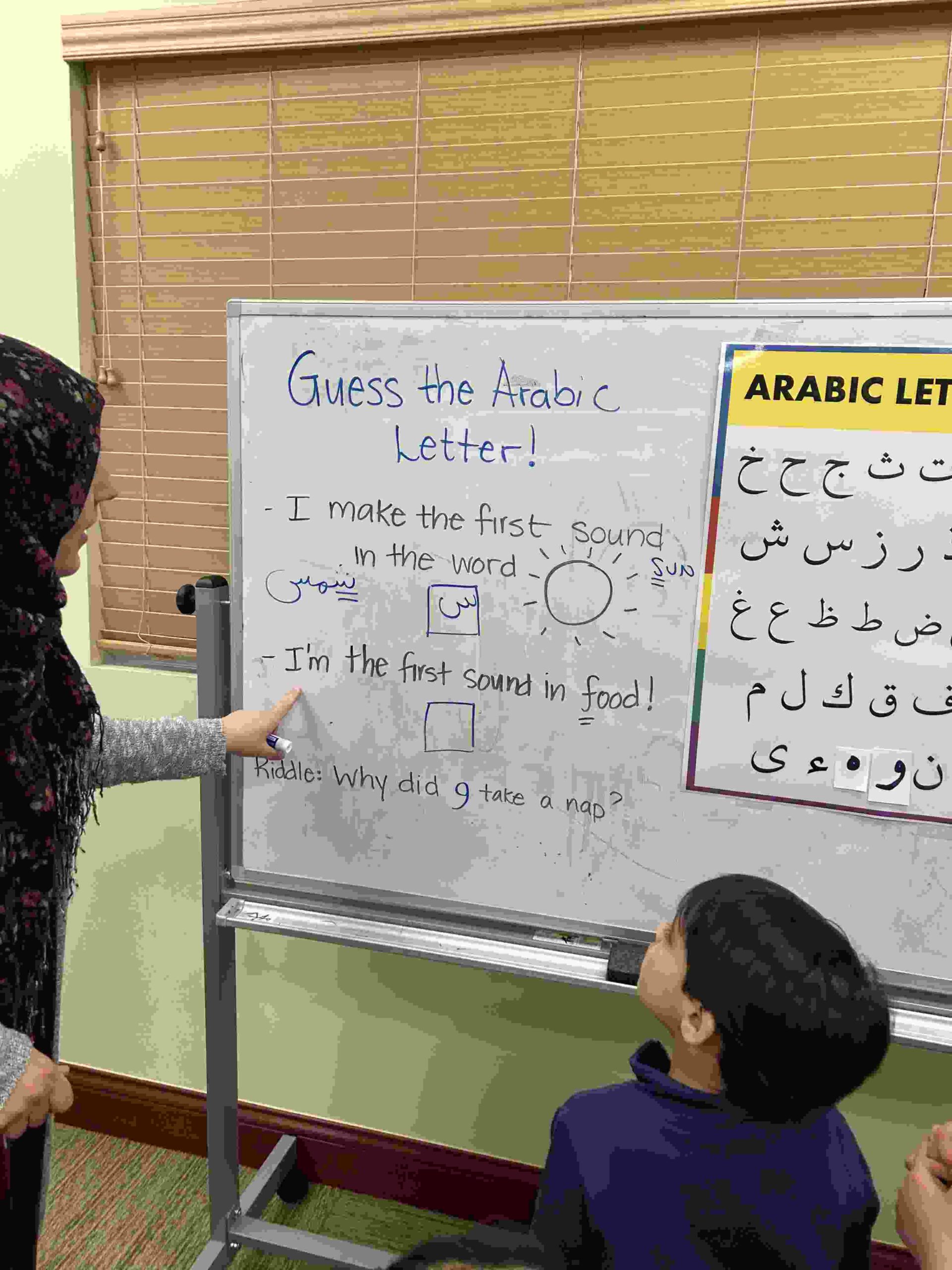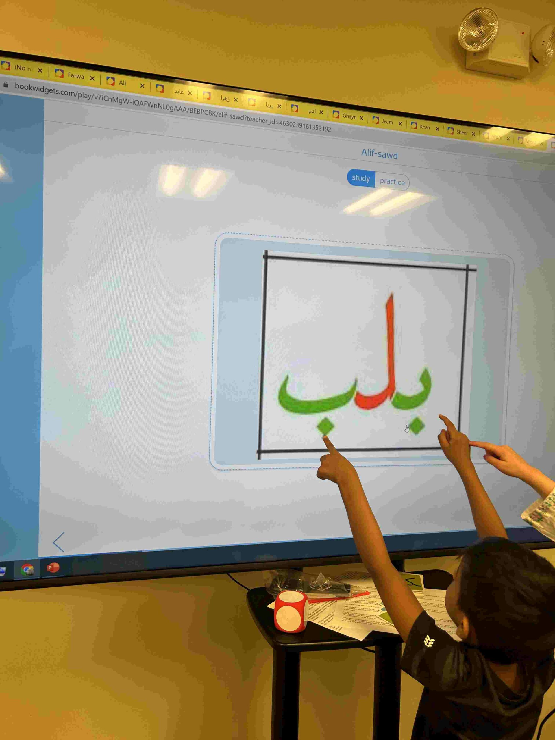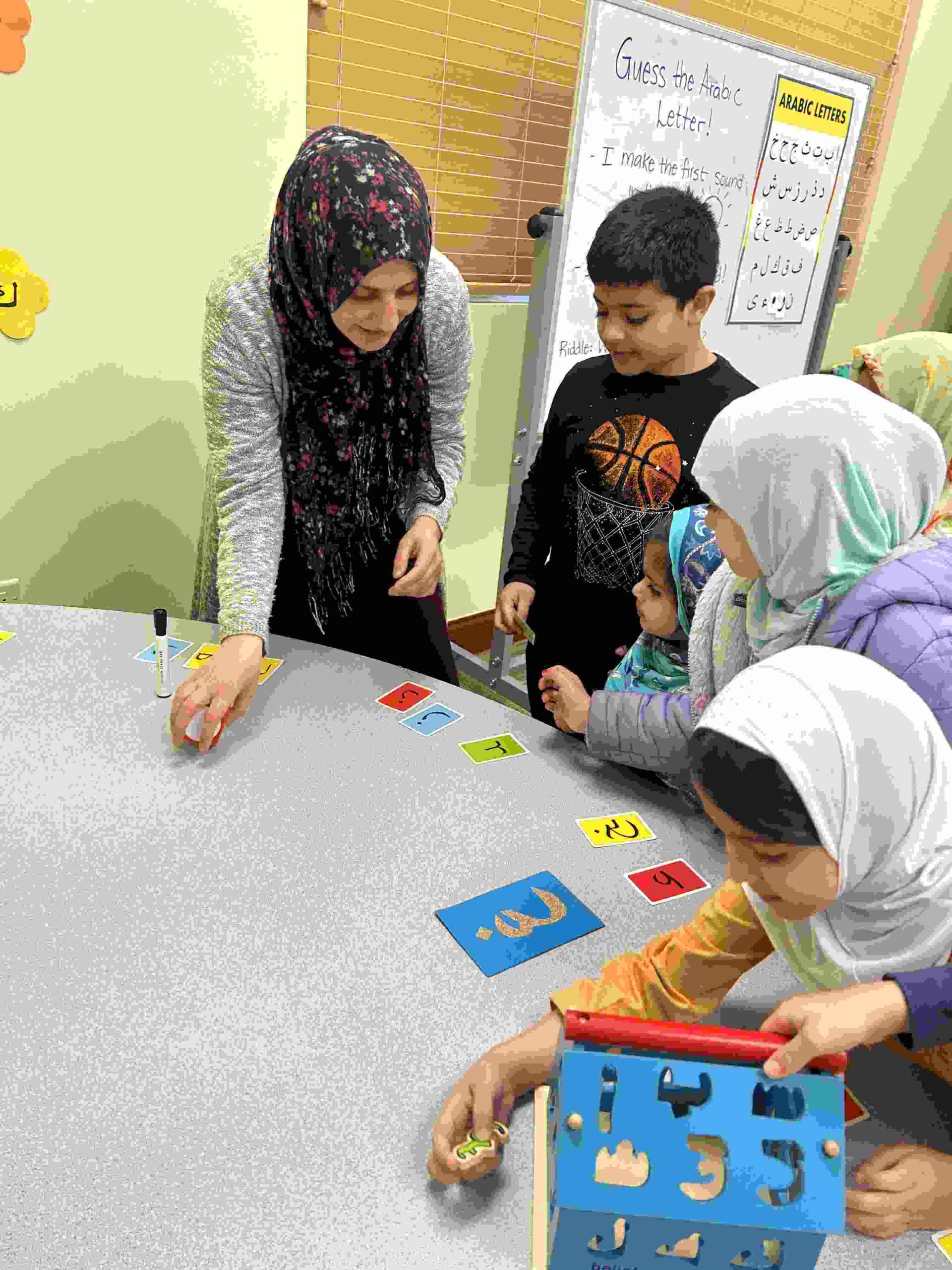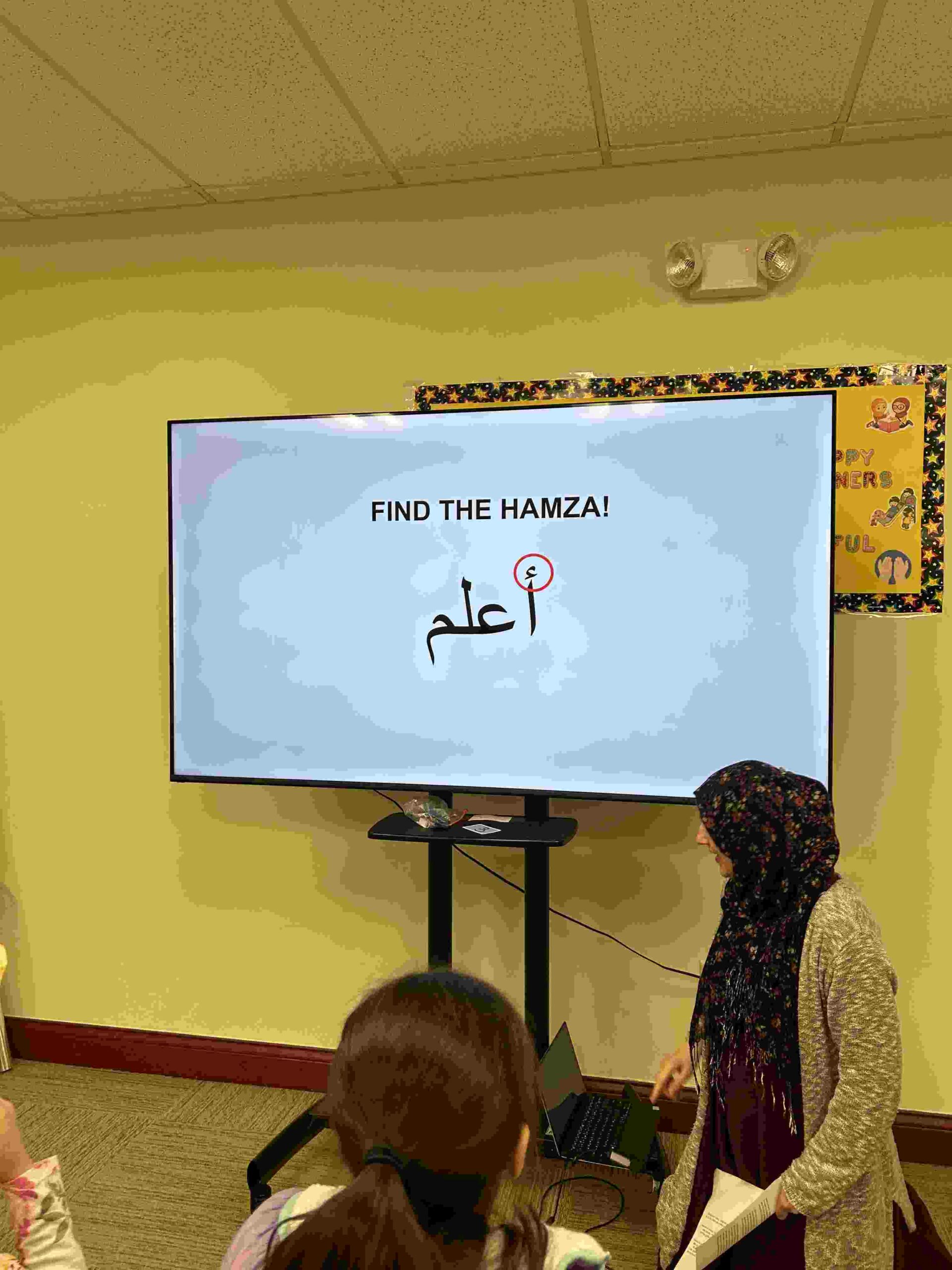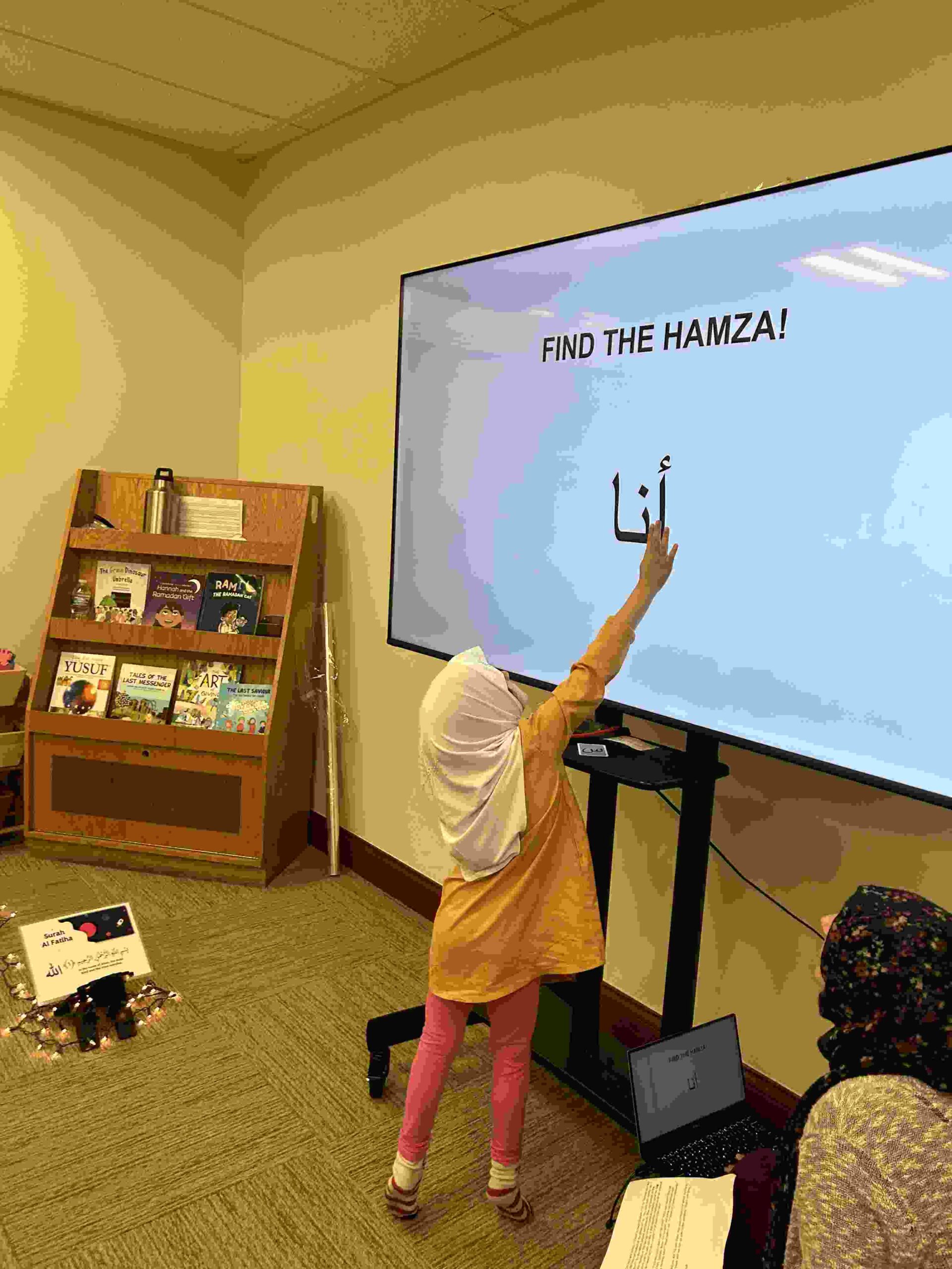 HAMZA: Kids were introduced to Hamza with a short poem and story to demonstrate how it’s a special letter that doesn’t change its shape but can be found on its own or sitting on top of or below other letters.