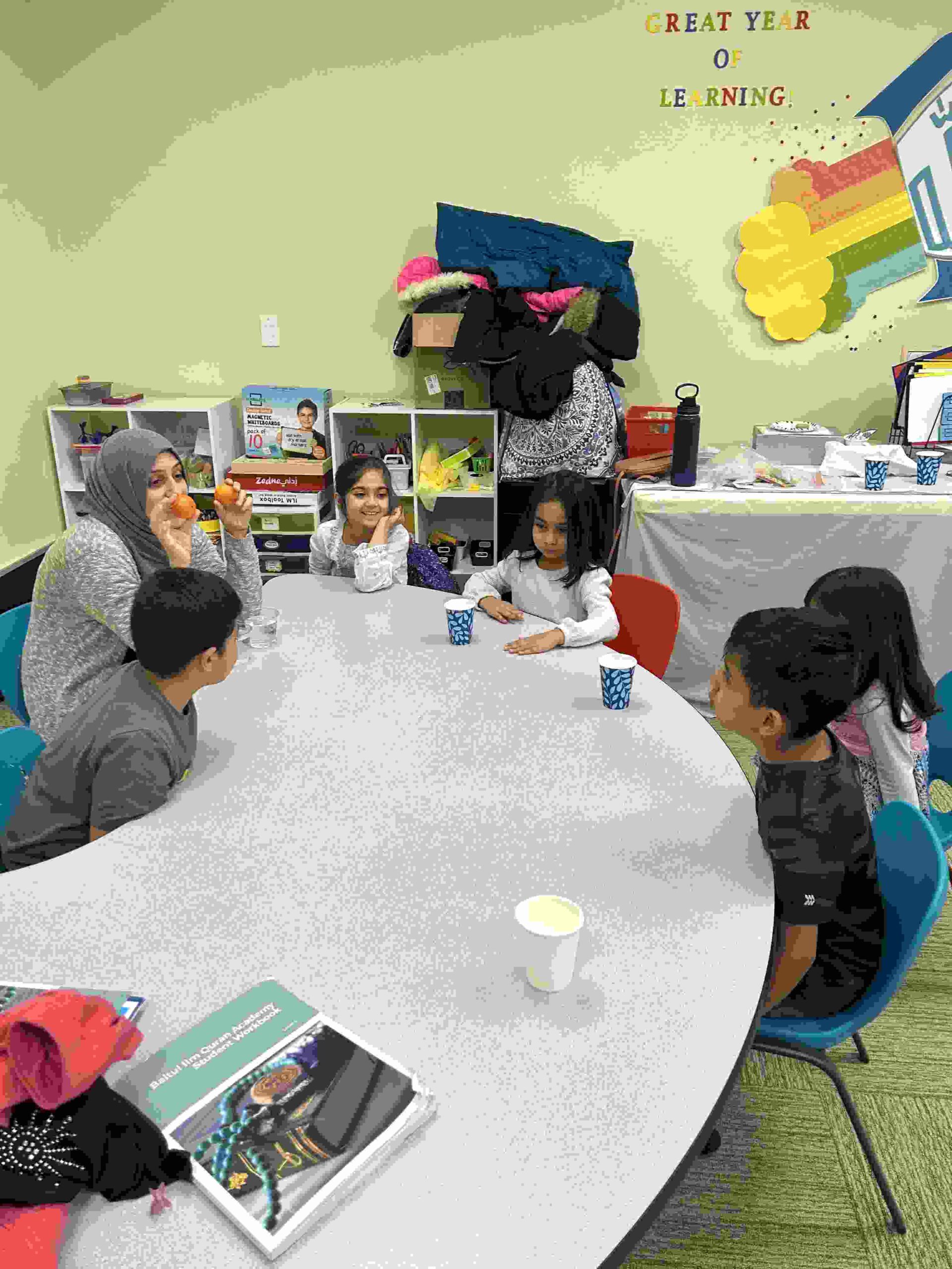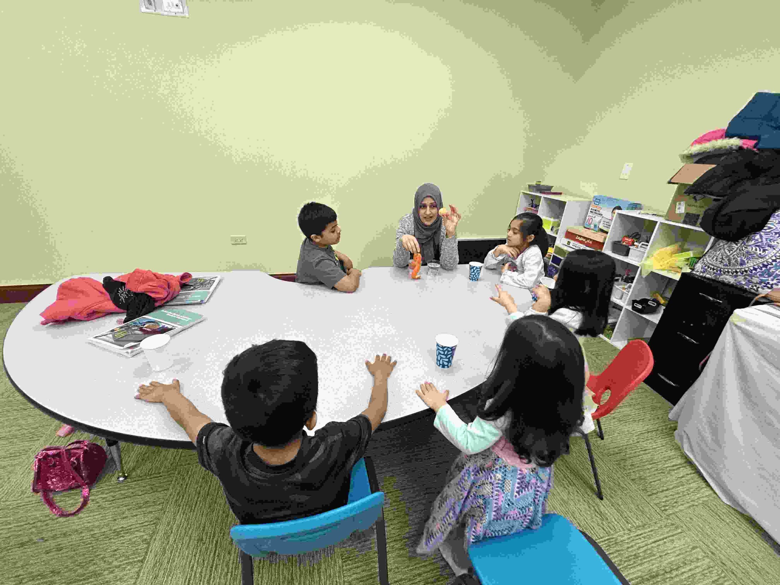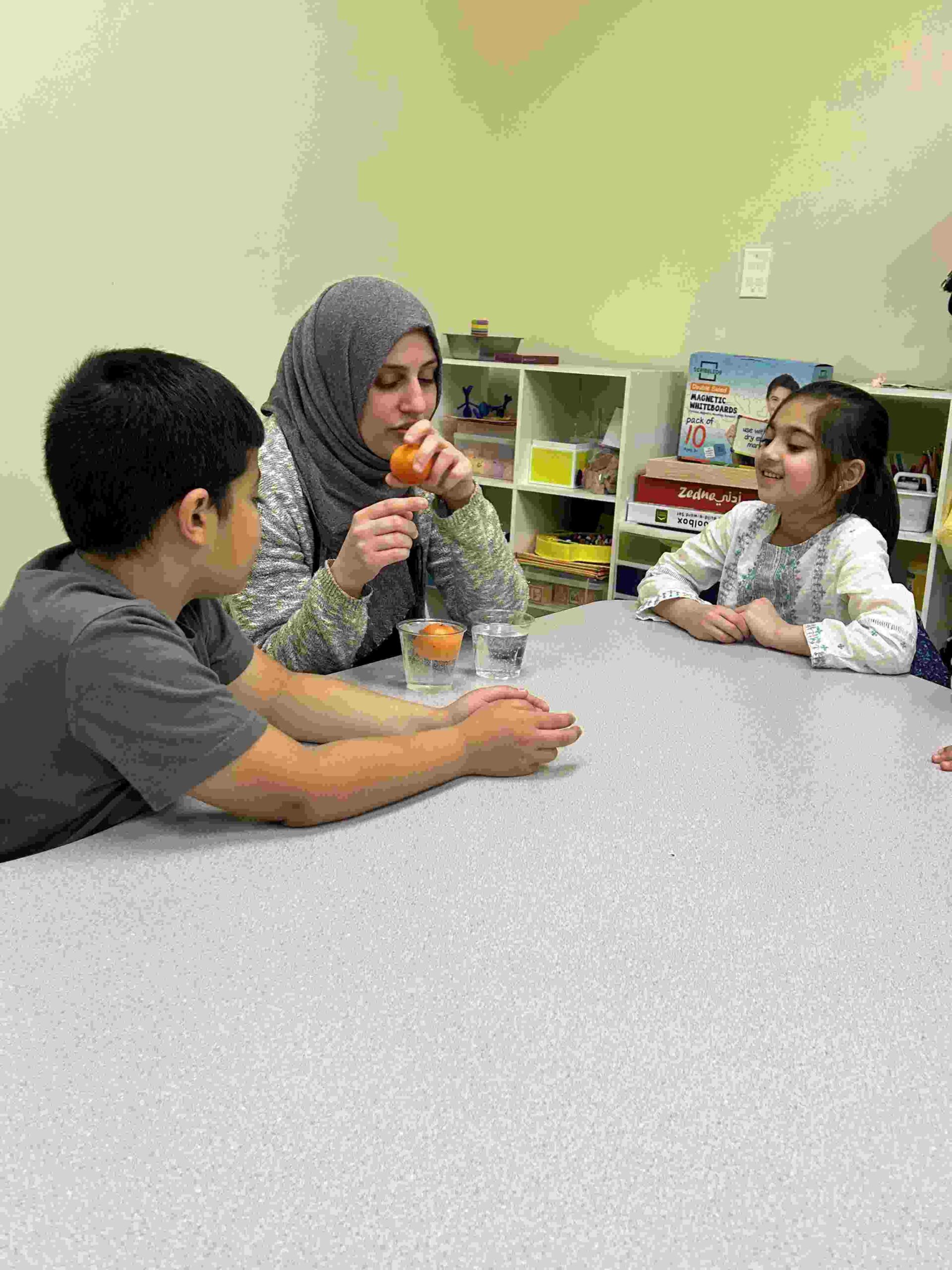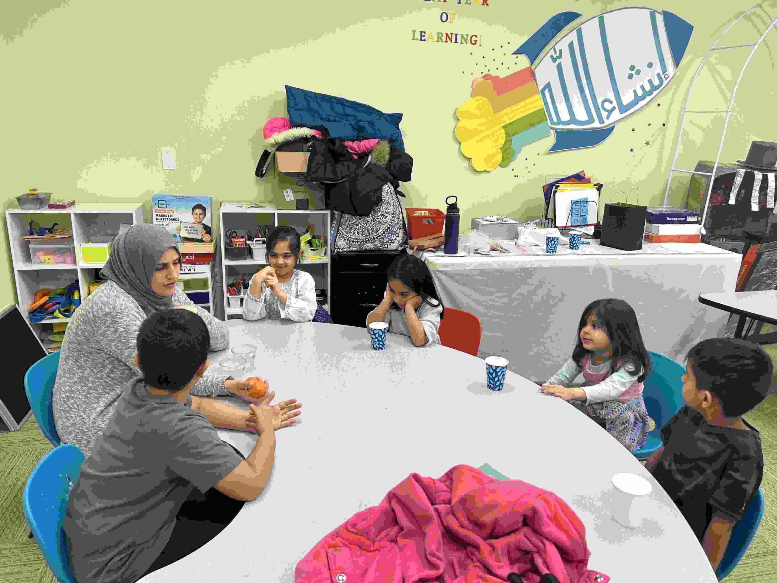 YA: We had a demonstration for the kids with a small cutie. The cutie floats when it has its peel on, and sinked without the peel. We explained to the kids that the orange peel is our certainty and trust in Allah’s guidance. With Allah’s help he will keep us floating and help us even in our most challenging times. Kids each had a turn to think of something personally challenging to them and drop the orange in the water.