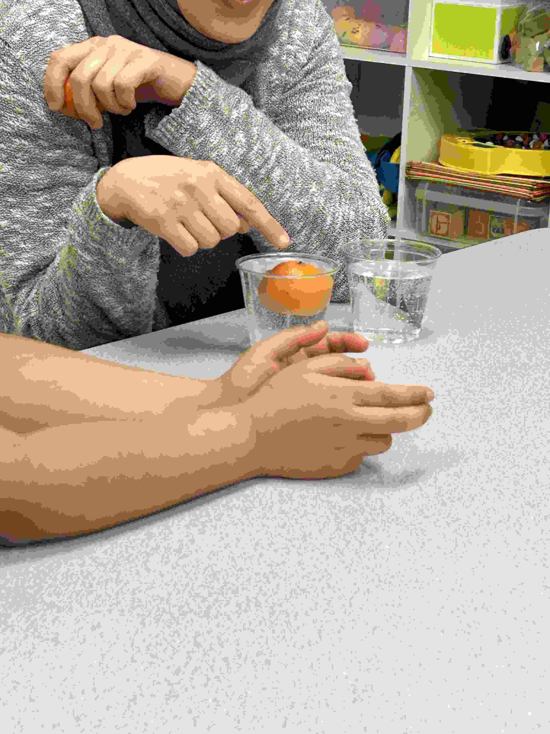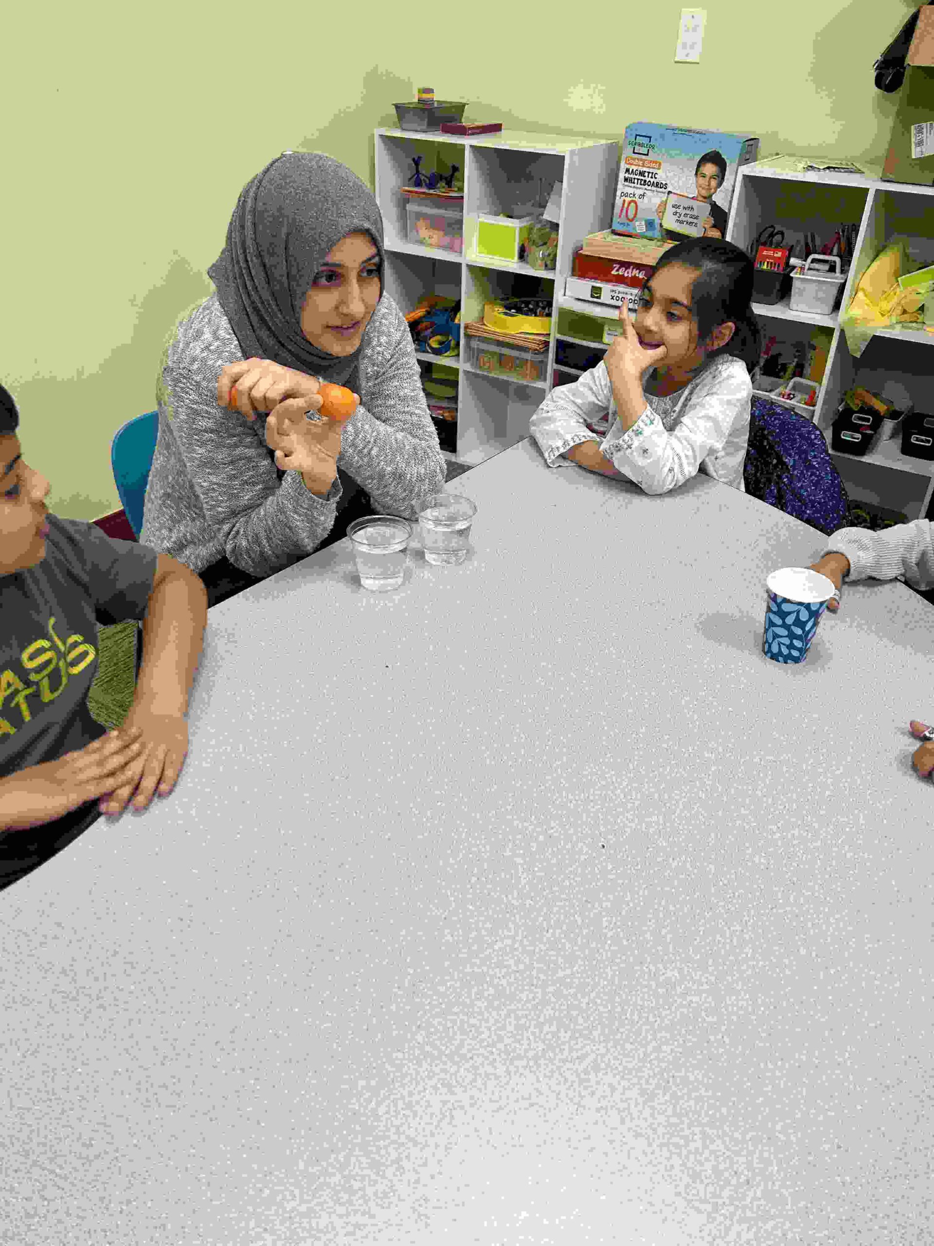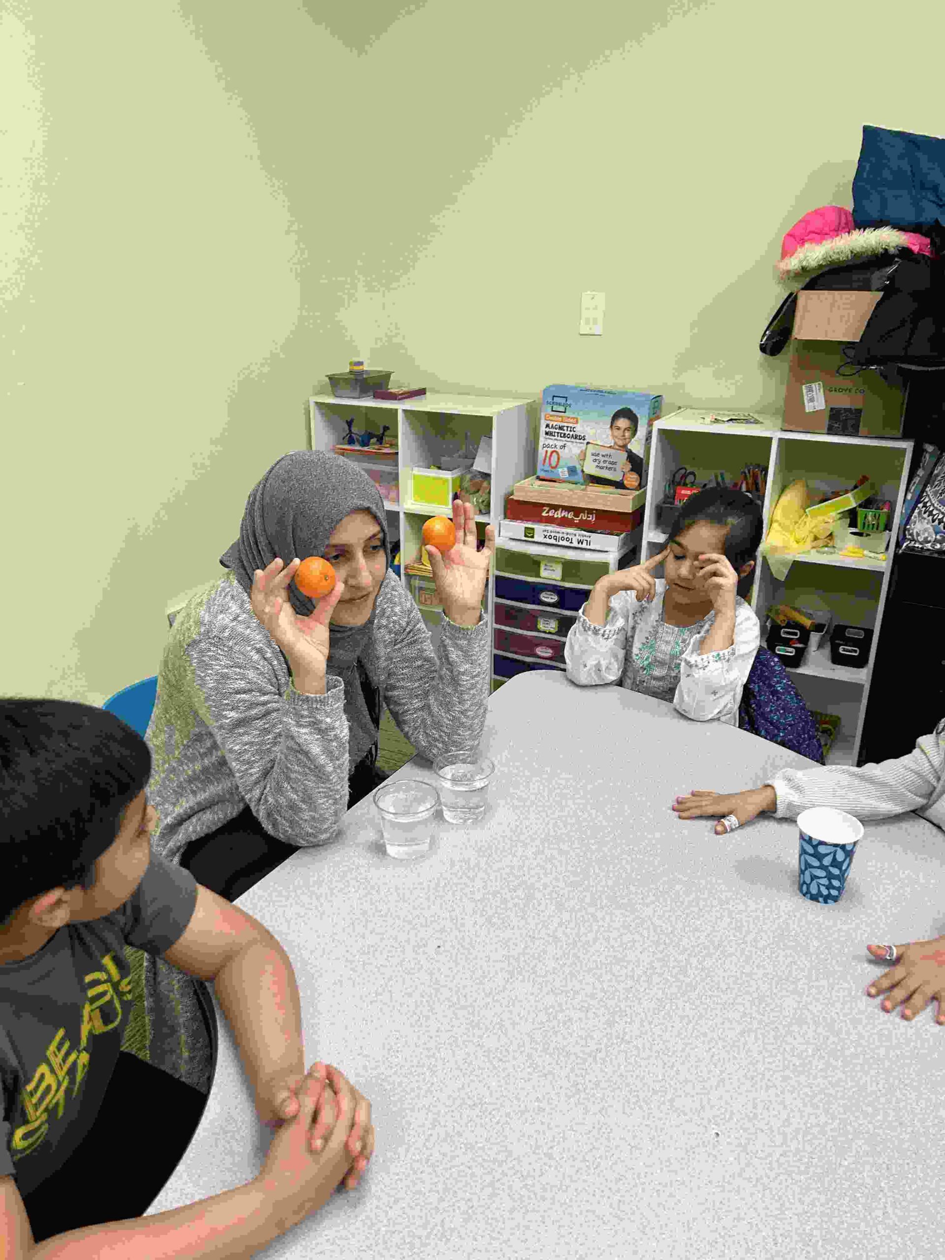 YA: We had a demonstration for the kids with a small cutie. The cutie floats when it has its peel on, and sinked without the peel. We explained to the kids that the orange peel is our certainty and trust in Allah’s guidance. With Allah’s help he will keep us floating and help us even in our most challenging times. Kids each had a turn to think of something personally challenging to them and drop the orange in the water.